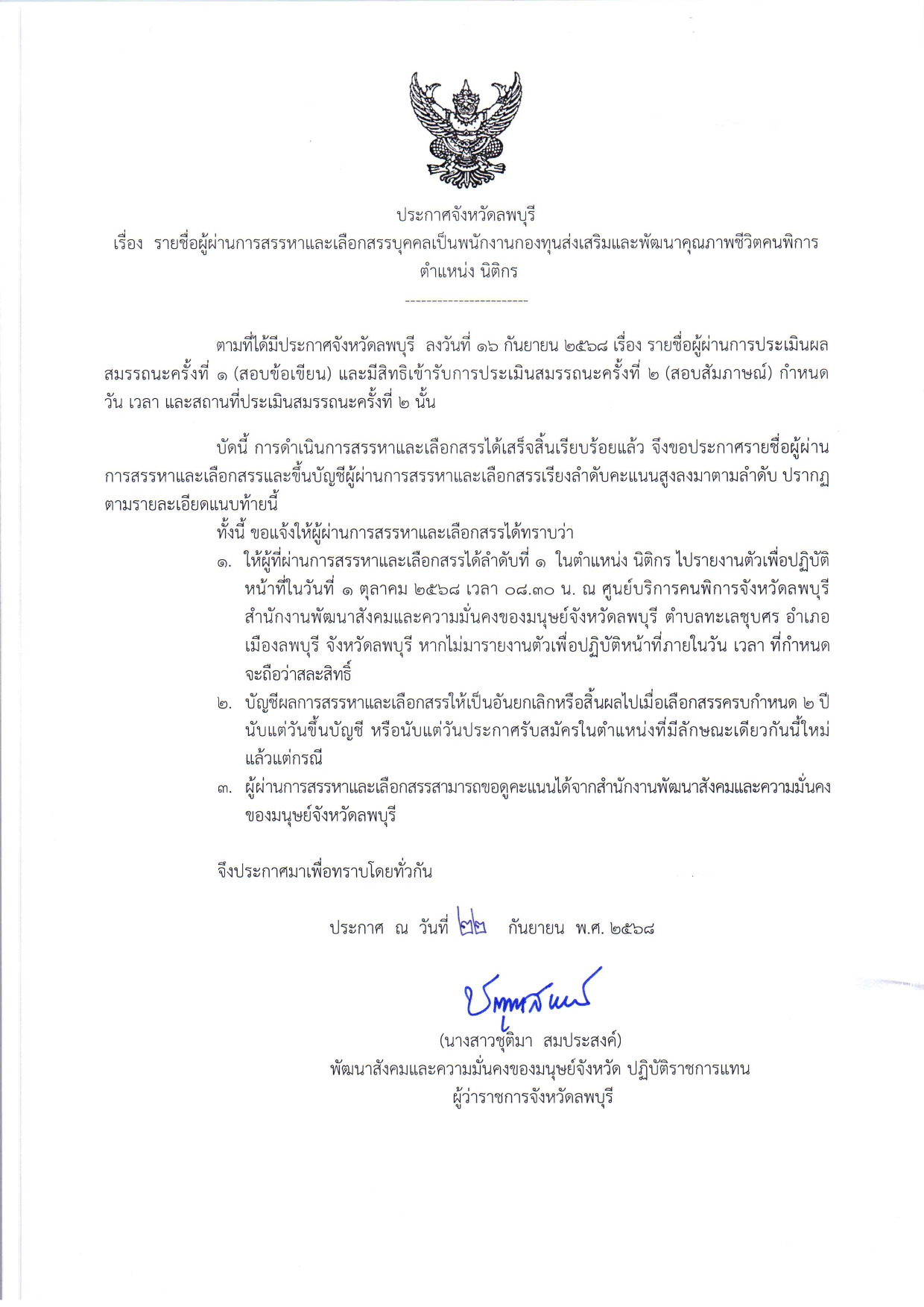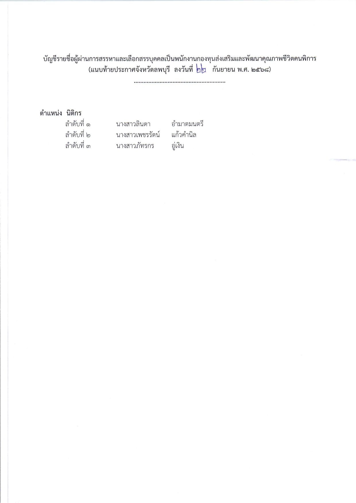📣 ประกาศ รายชื่อผู้ผ่านการสรรหาและเลือกสรรบุคคลเป็นพนักงานกองทุนส่งเสริมและพัฒนาคุณภาพชีวิตคนพิการ ตำแหน่ง นิติกร
