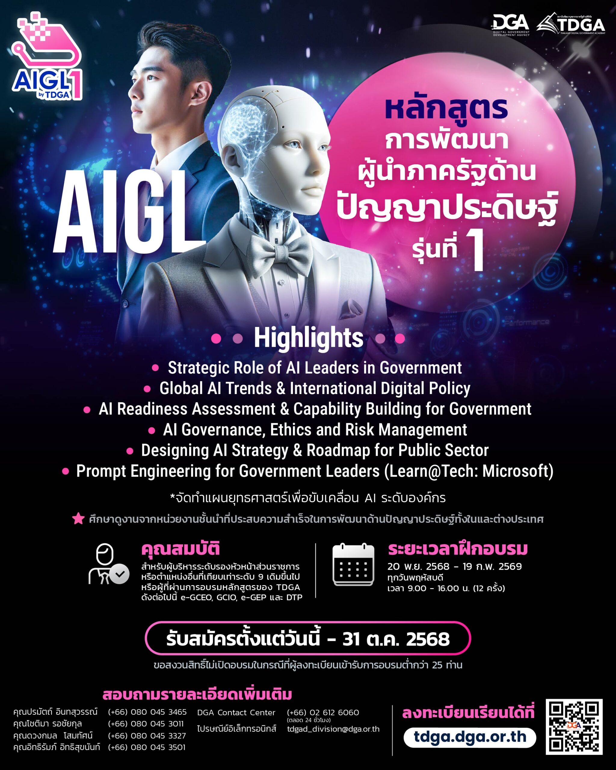 ประชาสัมพันธ์ หลักสูตรการพัฒนาผู้นำภาครัฐด้านปัญญาประดิษฐ์ รุ่นที่ 1 (AI Government Leader Development : AIGL#1)By admin / October 9, 2025 ลงทะเบียน AIGL1 >> คลิกที่นี่ << ที่มา : สำนักงานพัฒนารัฐบาลดิจิทัล (องค์การมหาชน)